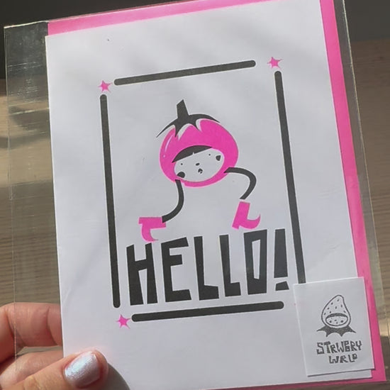 Handmade risograph card. This little tomato means business! Not all cards are the same as they are individually printed, some might be more funky!